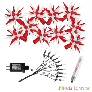 The White/Red Herrnhut Plastic Star Chain is a gorgeous and versatile light chain that connects 10 original Herrnhut stars, each approximately 13 cm / 5 inches in diameter. It comes complete with 10 lights with clips, LEDs, a transformer, assembly instructions, and a brochure. The stars are already assembled for easy installation over the lights. By tradition, this product is still handmade in Germany.